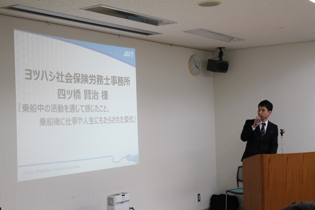 昨年度乗船した青年会議所メンバーから研修スケジュールや研修方針の説明させて頂きました、また、昨年度一般乗船者の四ツ橋賢治君からは乗船経験談を話して頂きました。一般乗船者の皆さんの不安が和らいでいくようでした。