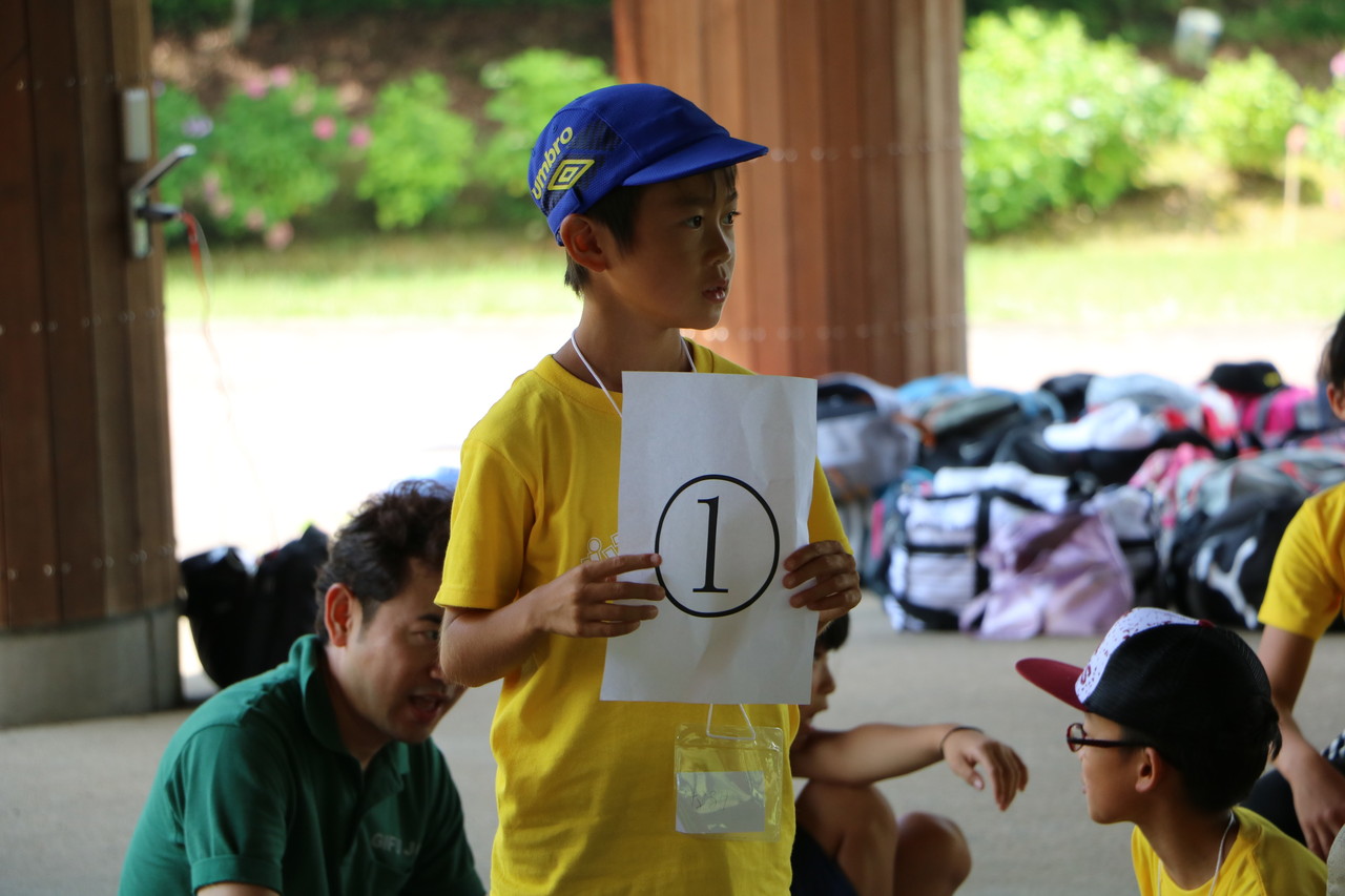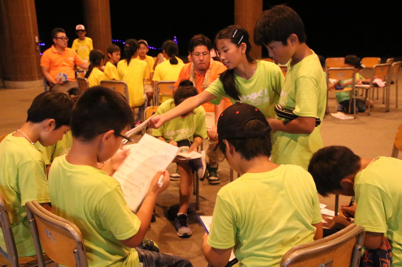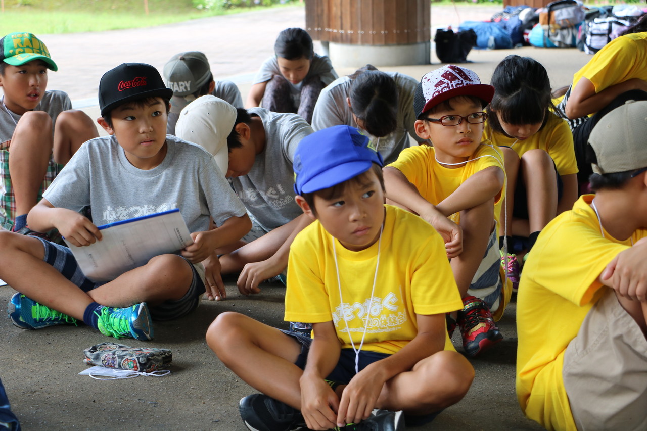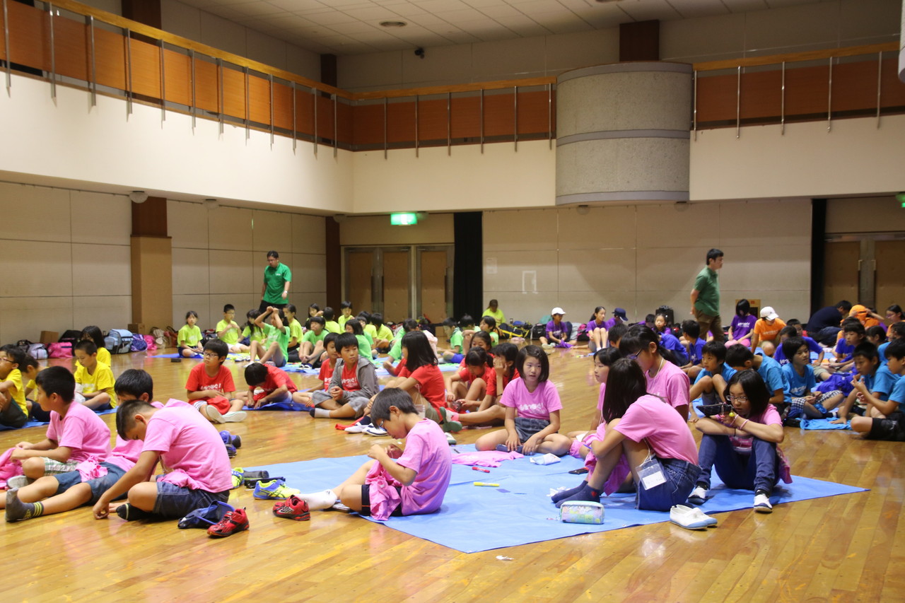 開会式と全体オリエンテーションが、いよいよ始まりました。子供たちは3日間の注意事項に真剣に耳を傾けていました。チーム毎のTシャツが配られました。
