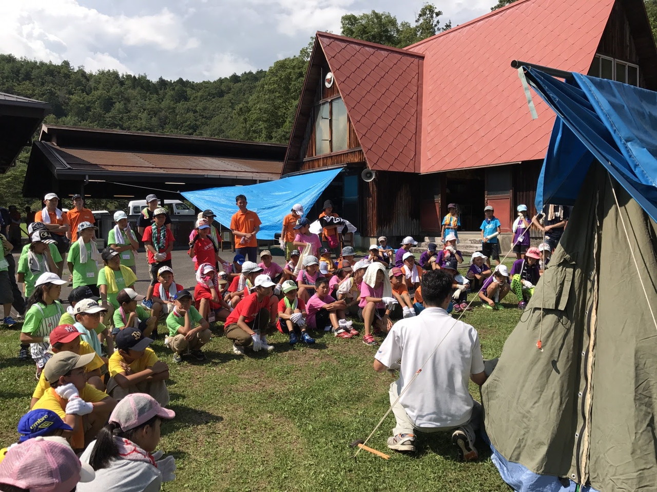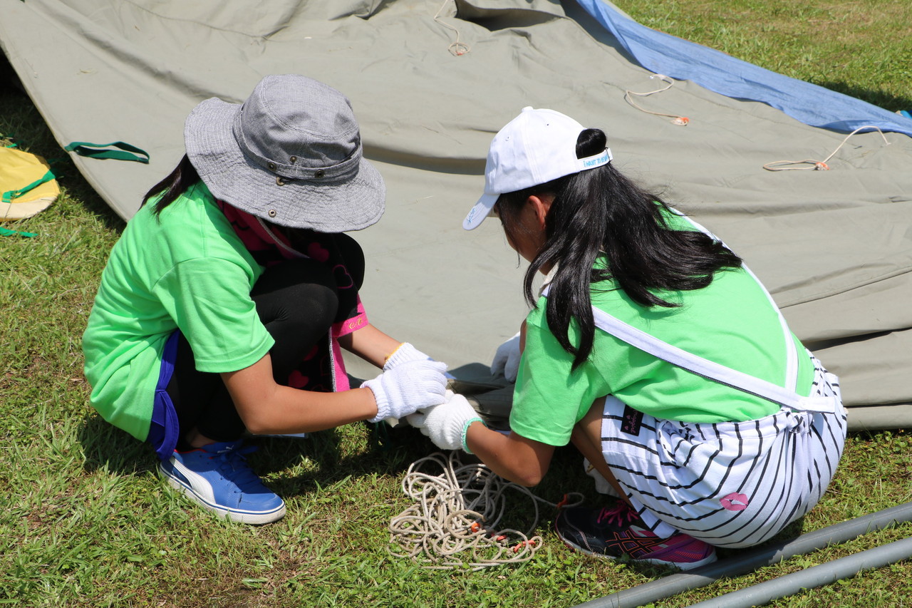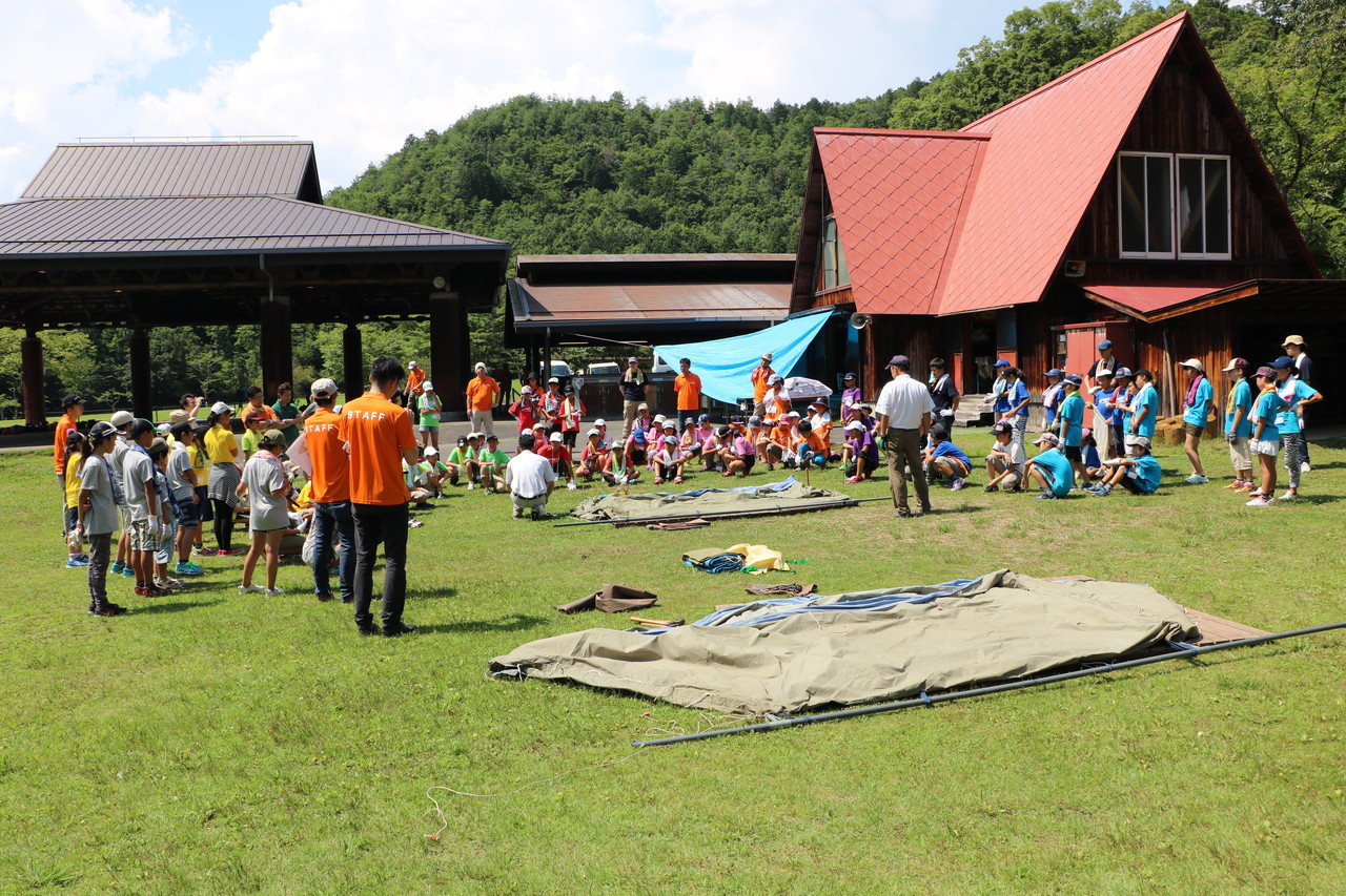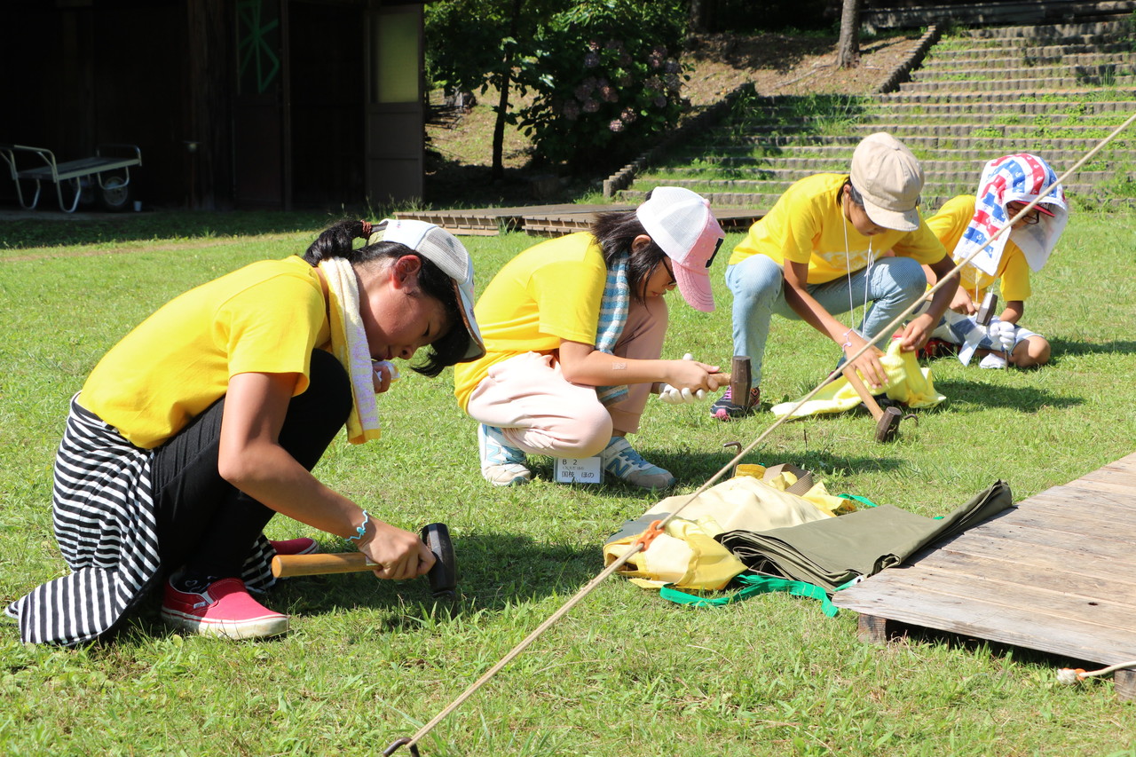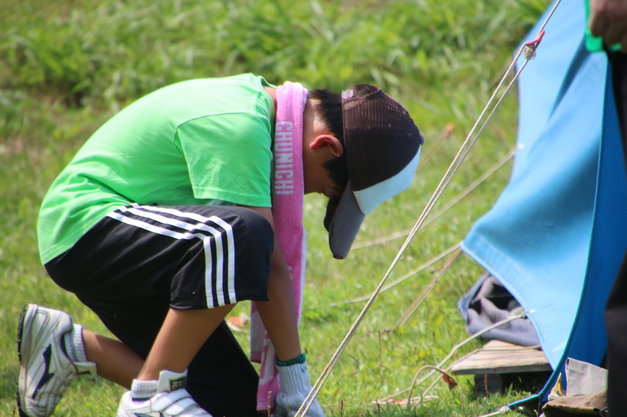 その後、夜使用するテント張りをしました。説明をしっかり聞いて、みんなで協力してテント張りができました。テントは一人では立てられません。ポールを支える役、地面に杭を打ち込む役、など、仲間と協力して自分達の寝るテントを立てていました。子供たちの、一生懸命、互いに声を掛け合う姿が印象的でした。自分達のテントが立った後、他のテントを手伝おうとする姿もありました。