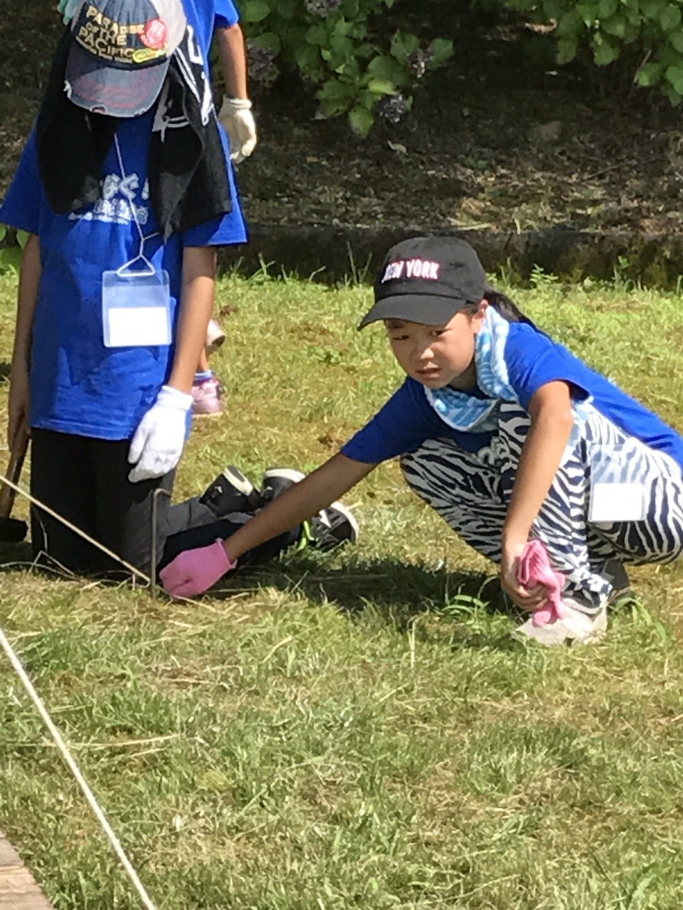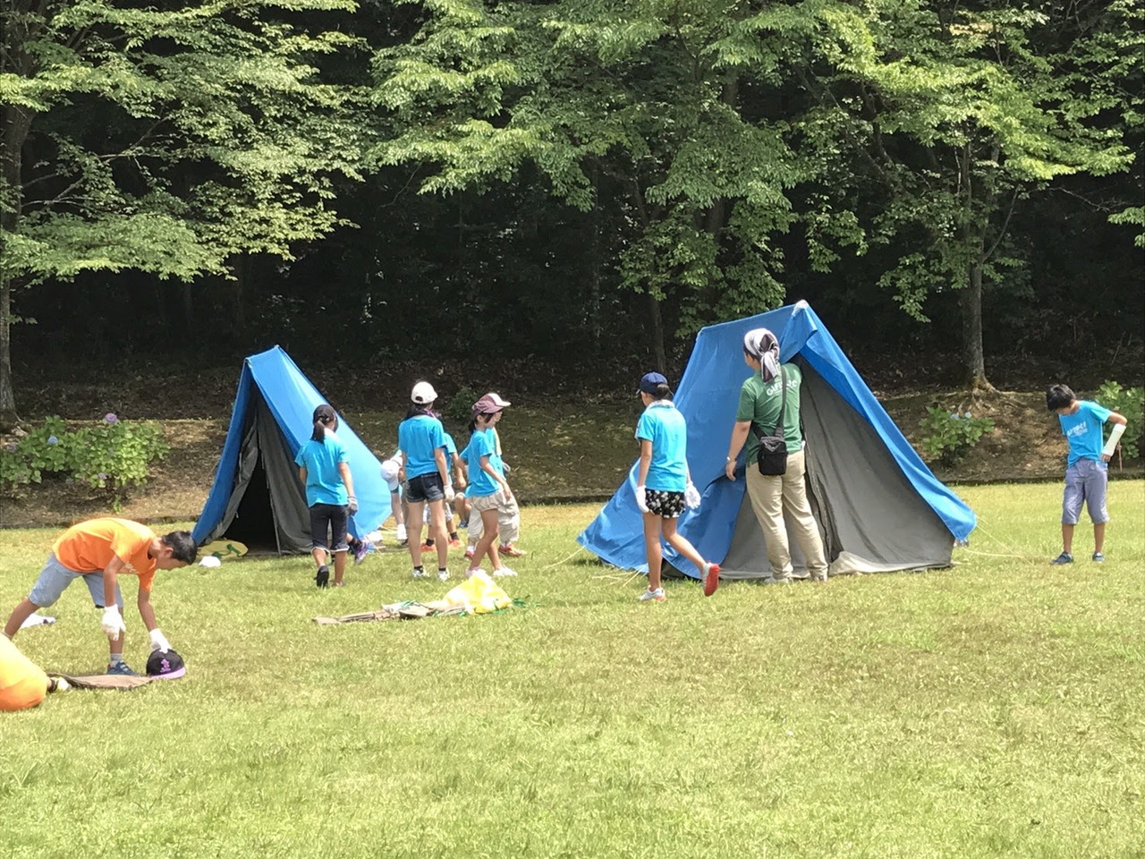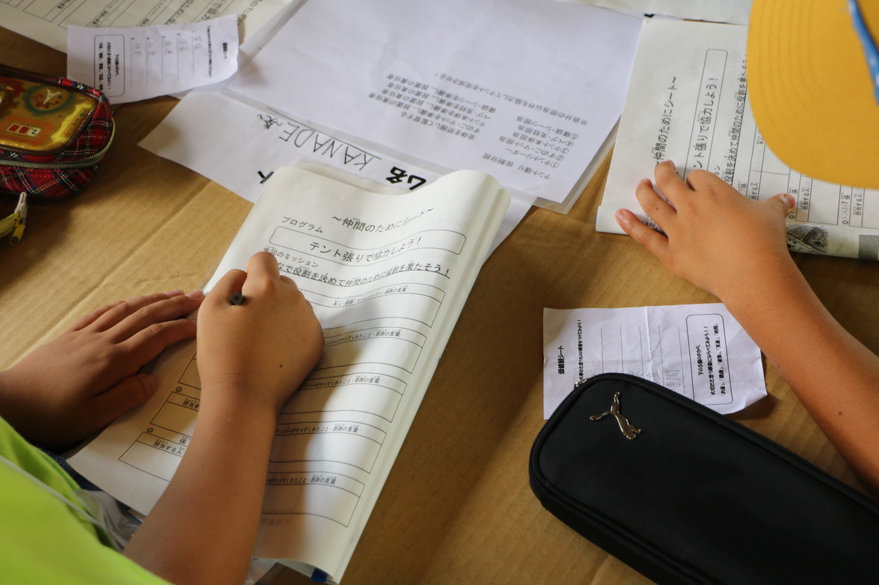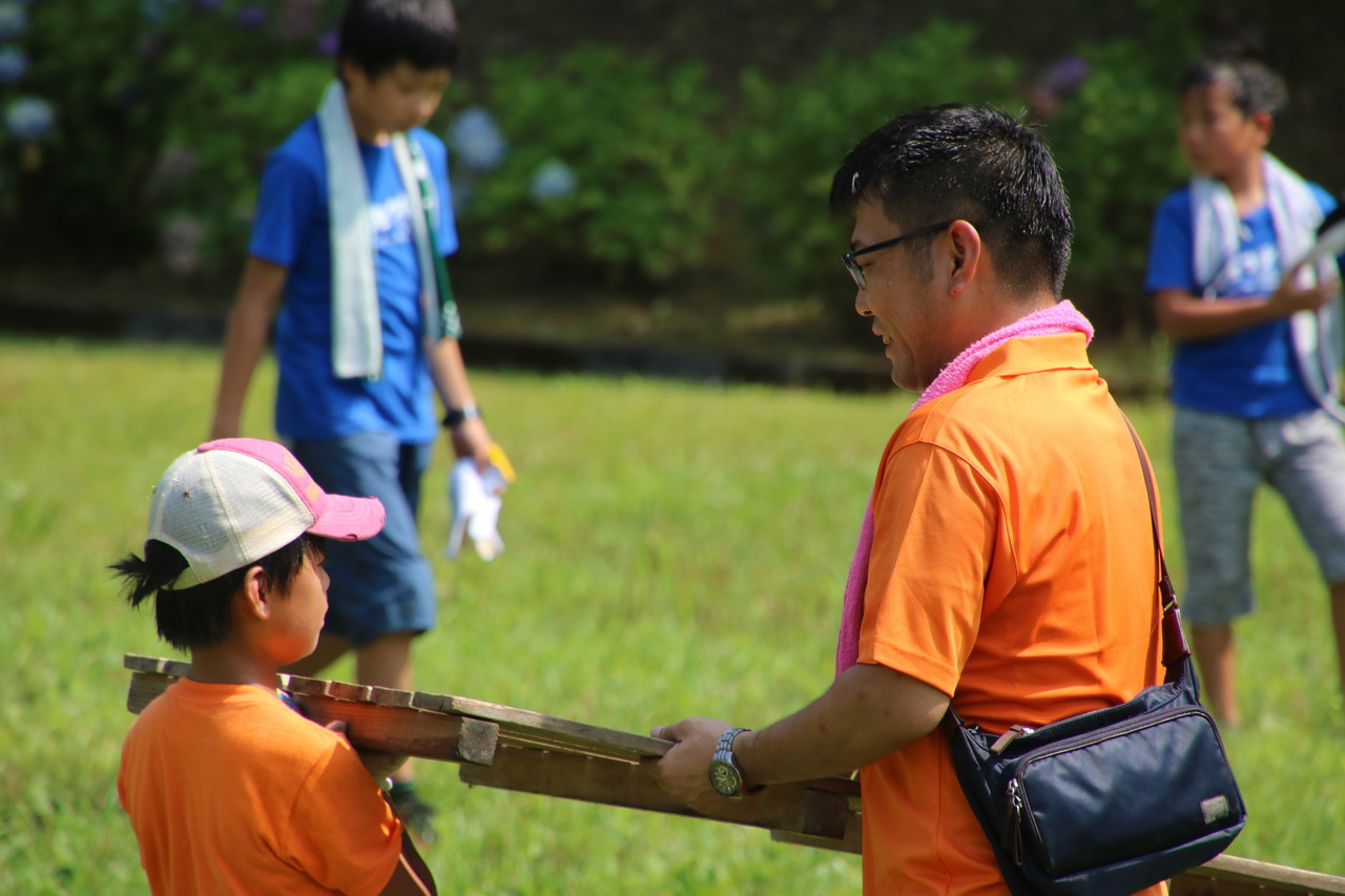 その後、夜使用するテント張りをしました。説明をしっかり聞いて、みんなで協力してテント張りができました。テントは一人では立てられません。ポールを支える役、地面に杭を打ち込む役、など、仲間と協力して自分達の寝るテントを立てていました。子供たちの、一生懸命、互いに声を掛け合う姿が印象的でした。自分達のテントが立った後、他のテントを手伝おうとする姿もありました。