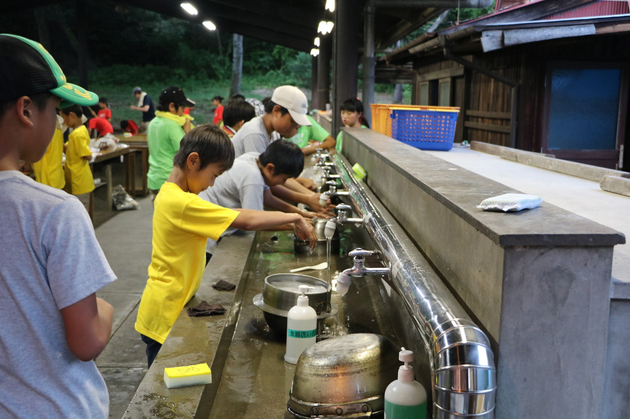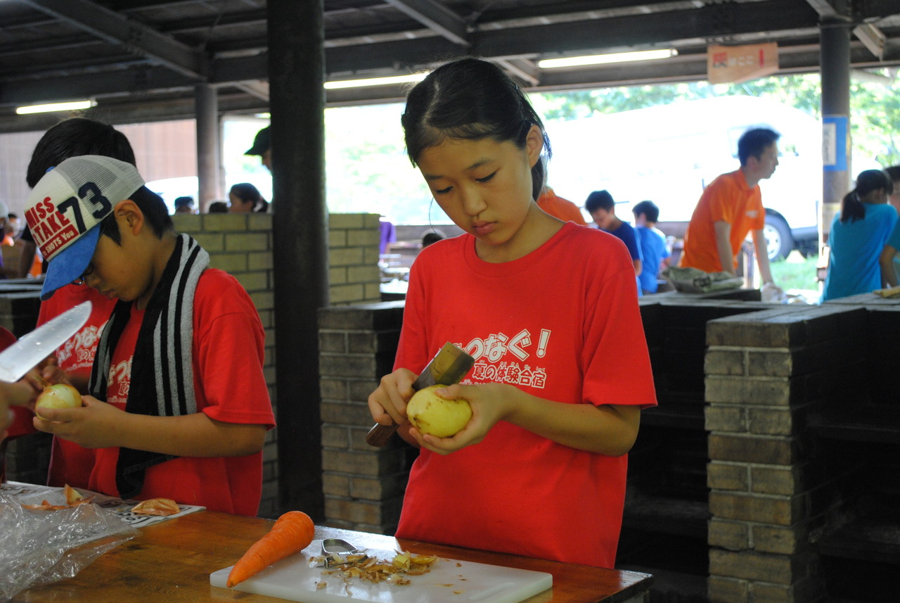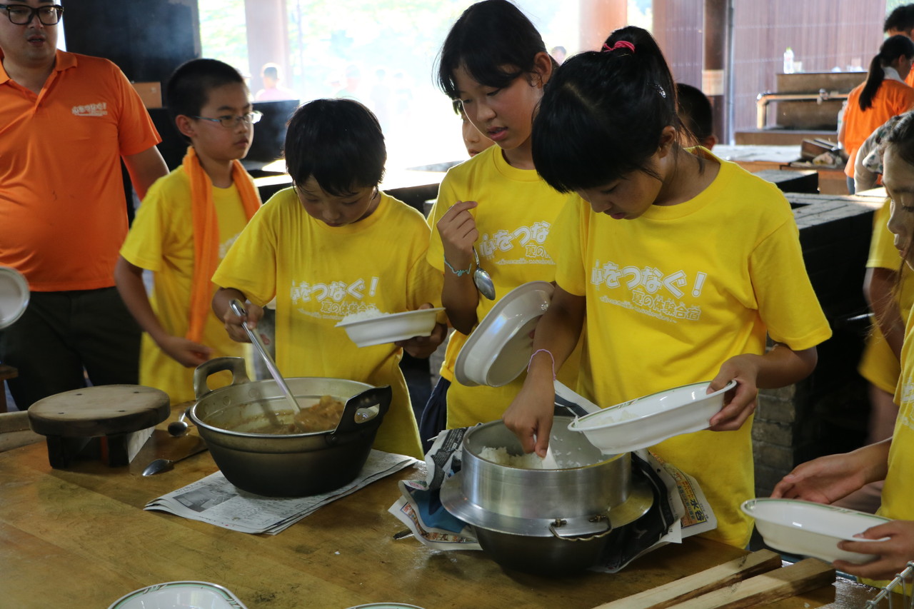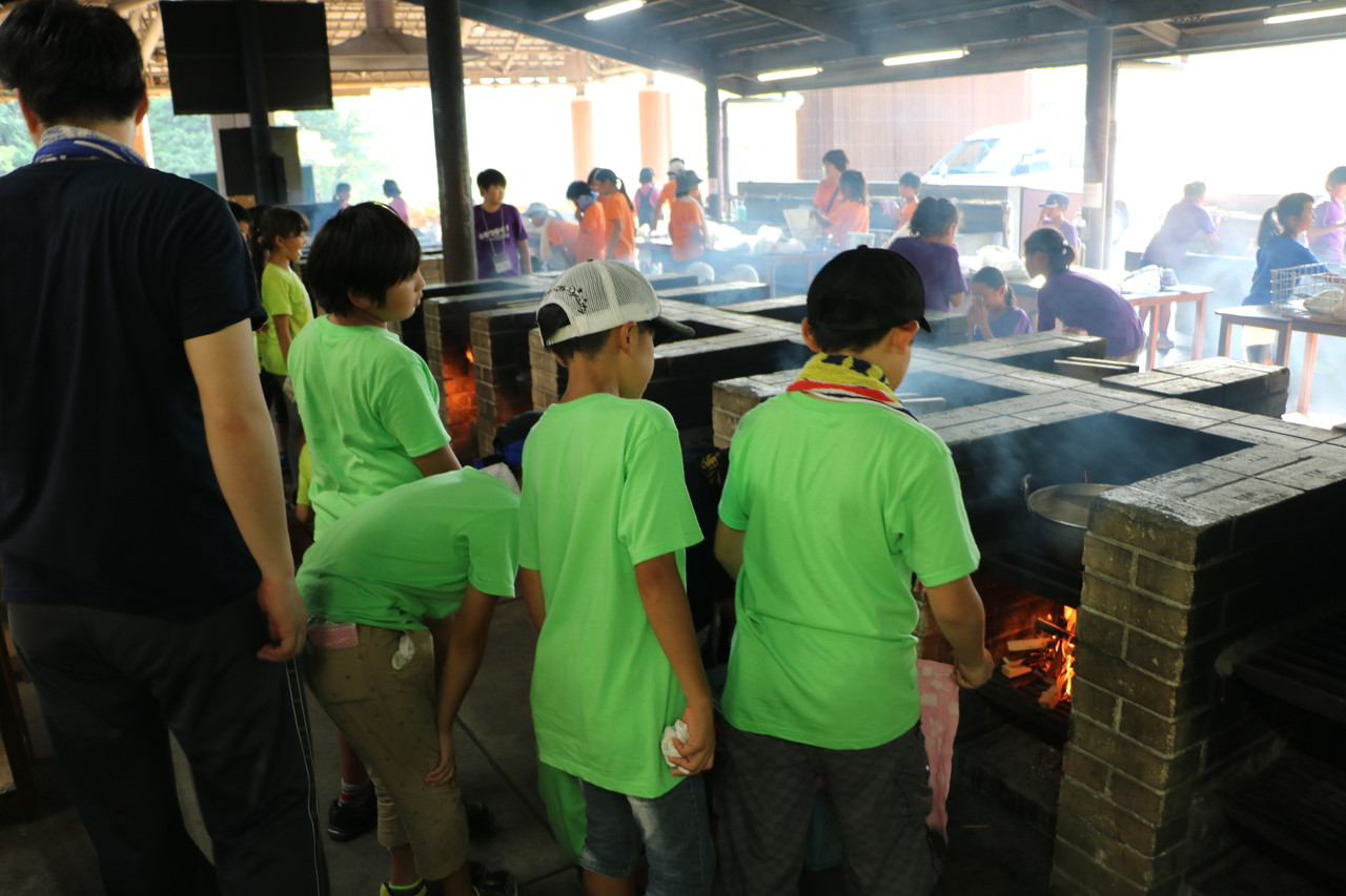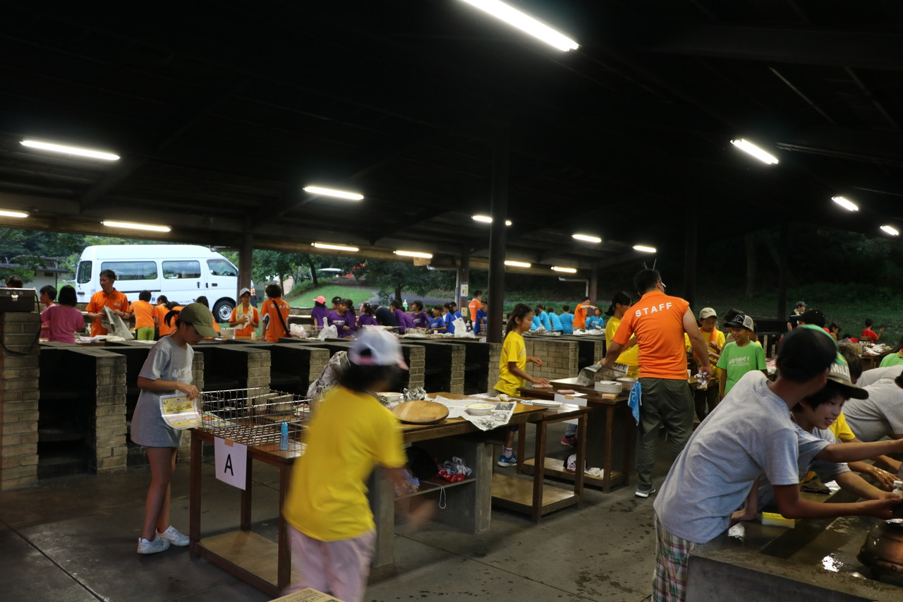 1日目の夕食。チームの仲間と協力し合い、カレー作りをしました。薪を組む人、野菜を切る人、火加減を調整する人、ご飯を炊く人、全ての役割の人が自分の役割を全うしないと美味しいご飯が炊けません。手順が書かれた紙を見ながら、互いに確かめ合いながら作業が進んでいきました。材料を落としてしまったチームがいましたが、他のチームから少しずつ分け合シーンがありました。自分たちのチームだけではなく、他のチームとも絆が少しづつ出来てきてることを感じました。
