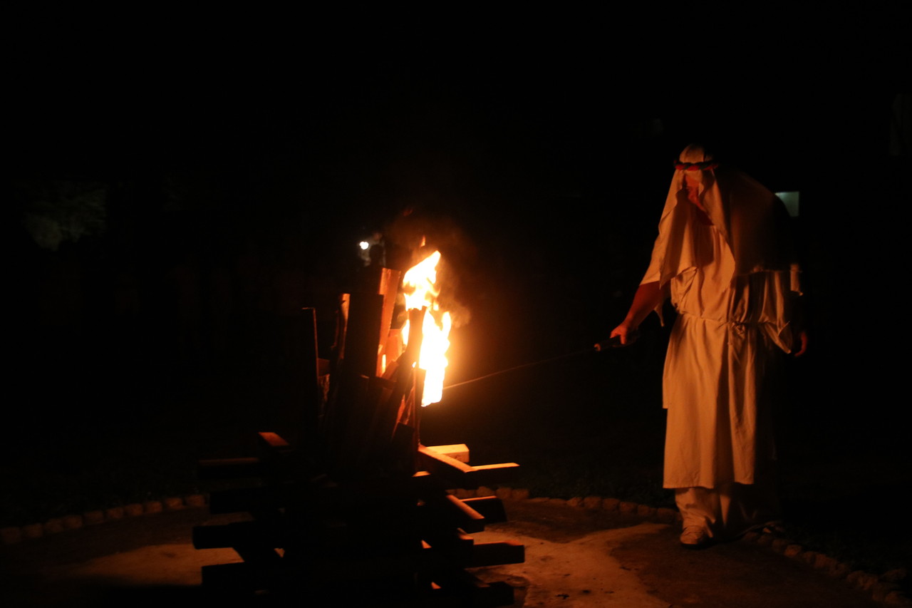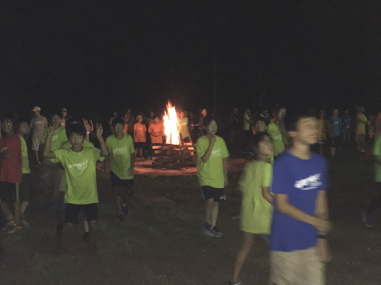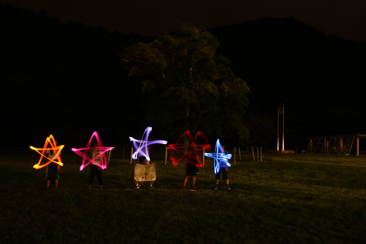 みんなでキャンプファイヤーを囲みました。その後には、ペンライトアートを体験しました。上手にできたかな?