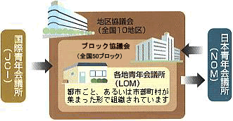 現在、全国に約700の青年会議所(LOM)があり、 LOMは50のブロック協議会を構成し、さらに10地区に分けられた地区協議会に集められています。 そして、すべてLOMと連絡し合いながら全国レベルの活動を行っているのが日本青年会議所 (NOM)です。ブロック(BC)、地区(DC)、日本青年会議所の役員はすべて各地の青年会議所から出向するメンバーによって構成されています。岐阜ブロックには17LOMが所属し、約870人の会員を有しています。 (2012年1月1日現在)