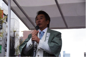 若宮町交差点にて、集まった市民の皆さんの前で 木遣りを披露。 |