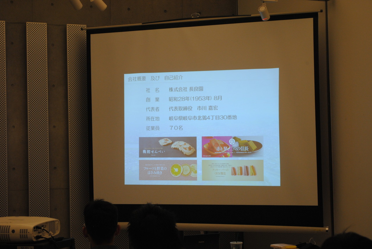 株式会社長良園は昭和28年8月に創業し65年目を迎えており、市川社長は4代目となります。従業員70名によって日々作られている会社の商品「鵜飼せんべい」「信長の赤」「信長の翠」「フルーツの野菜とはさみ焼き」などについて、誕生秘話を交え紹介頂きました。