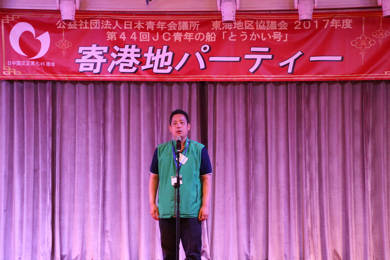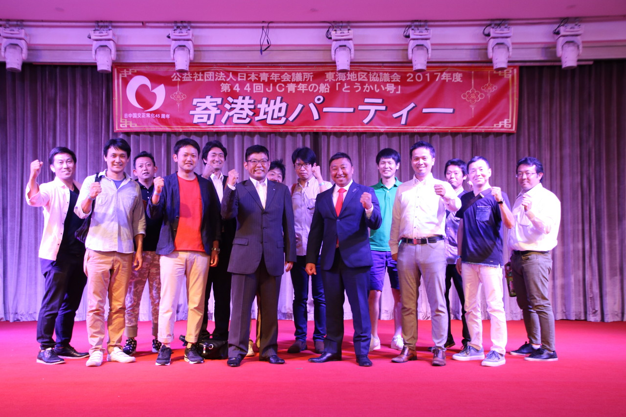 「とうかい号」が上海の地に到着し、乗船者は寄港地研修を行いました。その中の一つであります寄港地パーティーでは、日本から激励に駆け付けたJCメンバーも参加することができ、岐阜JCメンバーも乗船者に激励の言葉をかけることができました。