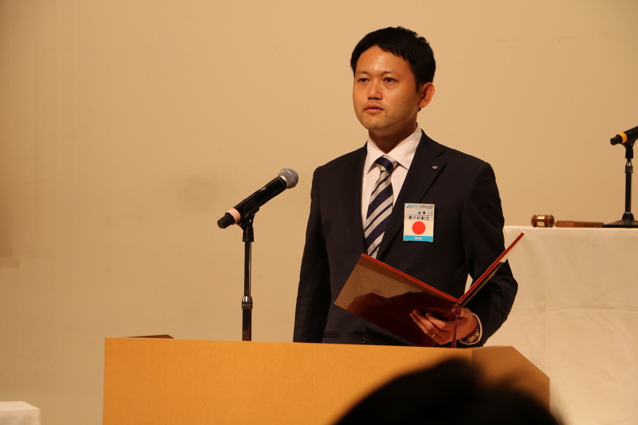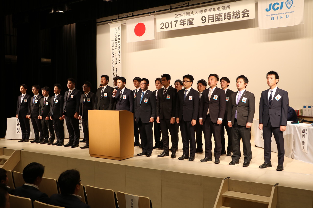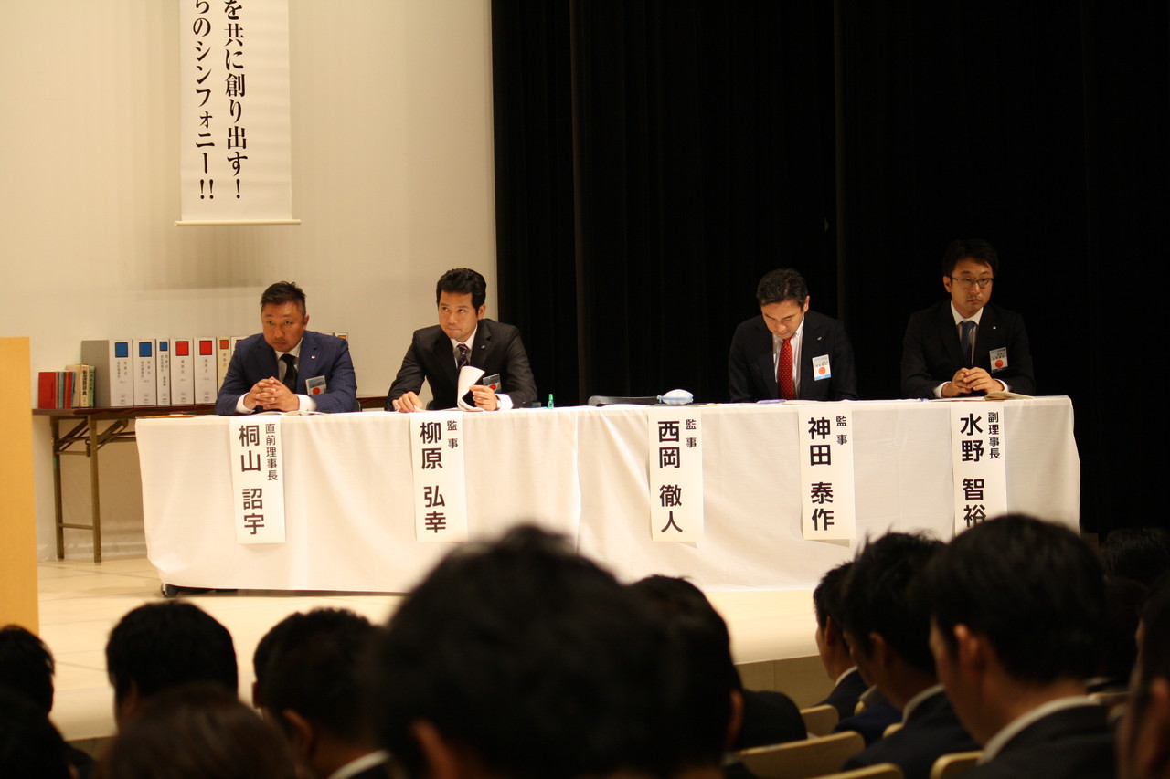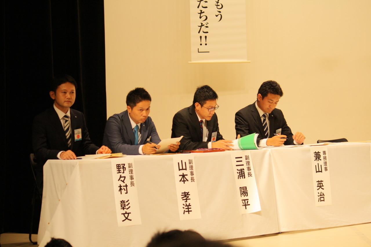 次年度の役員メンバーが壇上に上がり、理事長候補者の野々村彰文君が2018年度への思いを掲げました。予定者全員でメンバーに対し次年度を背負う覚悟をもって「よろしくお願い致します。」と声を合わせました。
