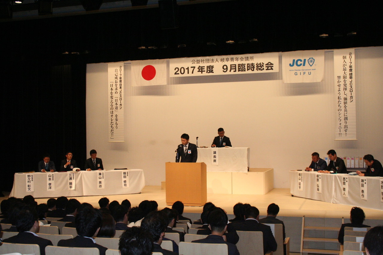 本年度は、2017年度理事長である篠田修司君が2017年度副理事長の野々村彰文君を2018年度理事長候補者として推薦する議案を上程し、メンバー全員の賛成をもって可決承認されました。続いて直前理事長、監事ならびに副理事長以下、20名の理事の役員人事議案が野々村彰文君から上程され、メンバー全員の賛成をもって可決承認されました。 2018年度の役員人事の可決承認後、野々村彰文君から2018年度に向けての決意が述べられ、臨時総会は厳粛な雰囲気の中、終了しました。