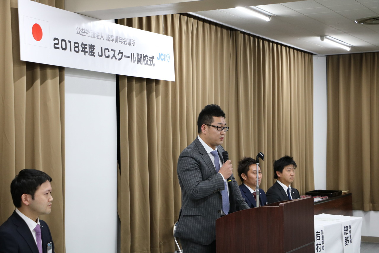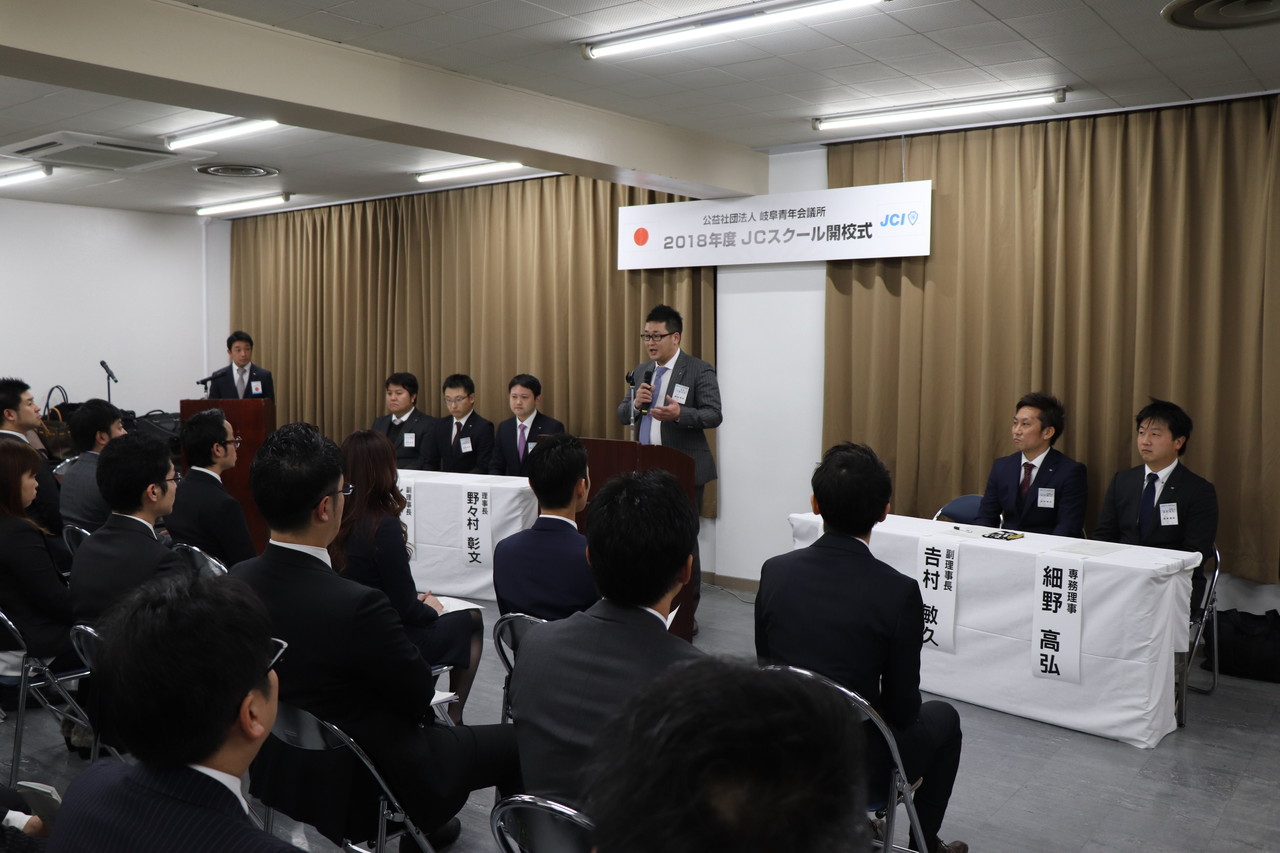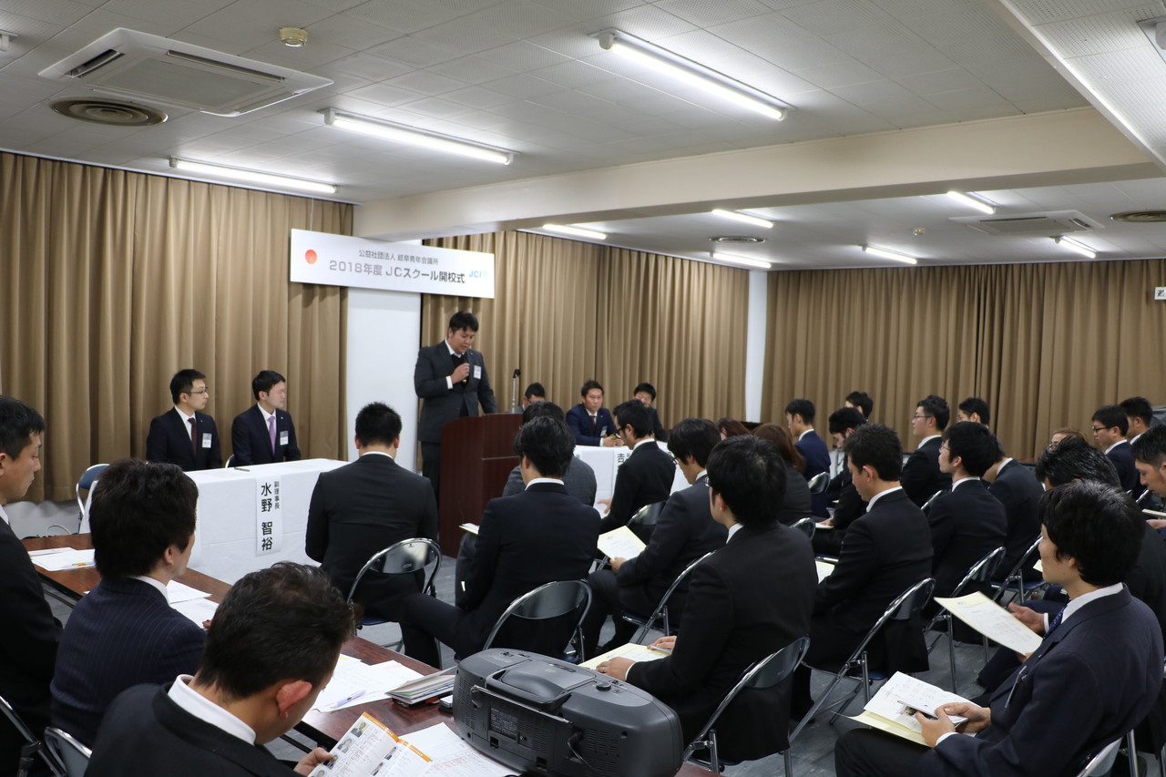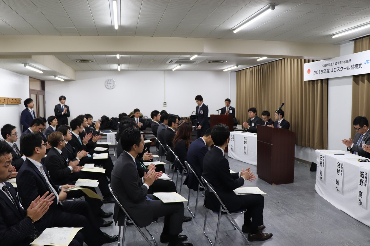 2018年1月8日(月)岐阜商工会議所4-A会議室にて、JCスクール開校式を開催しました。JCスクール委員会には入会初年度のメンバーが所属し、1年間JC運動・JC活動の意義目的や理念を学ぶことで、2年目以降の活動の基礎を作ります。開校式はそのスタートとなる行事であり、厳粛な雰囲気のもと行われました。入会初年度のメンバーにとっては岐阜青年会議所のメンバーとしての責任を自覚することになるとともに、これから始まるJC活動への決意を新たにする機会となりました。
