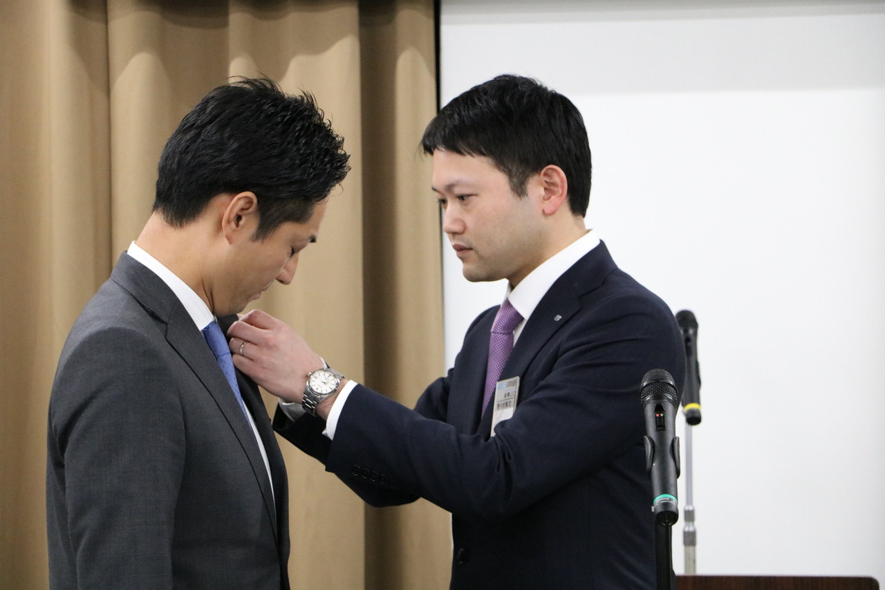 新入会員一人ひとりに入会承認証が授与されました。また、青年会議所メンバーの証であるネームプレートとバッジを付けて頂き、固い握手を交わしました。