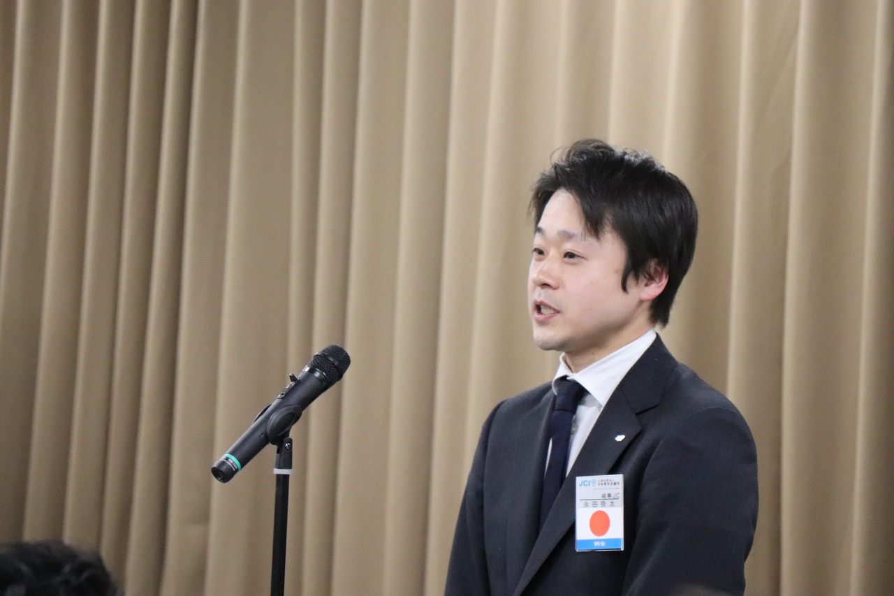 担当副理事長であるJCスクール校長石榑利彦君より、「1年1年どういう気持ちで、どのように活動をしていくのかが一番大事です。まずは自分の上限にまで達してもらい、そこから一歩踏み込んだところに成長があるので程々に無理をしながら活動して欲しいです」と激励の言葉が送られました。