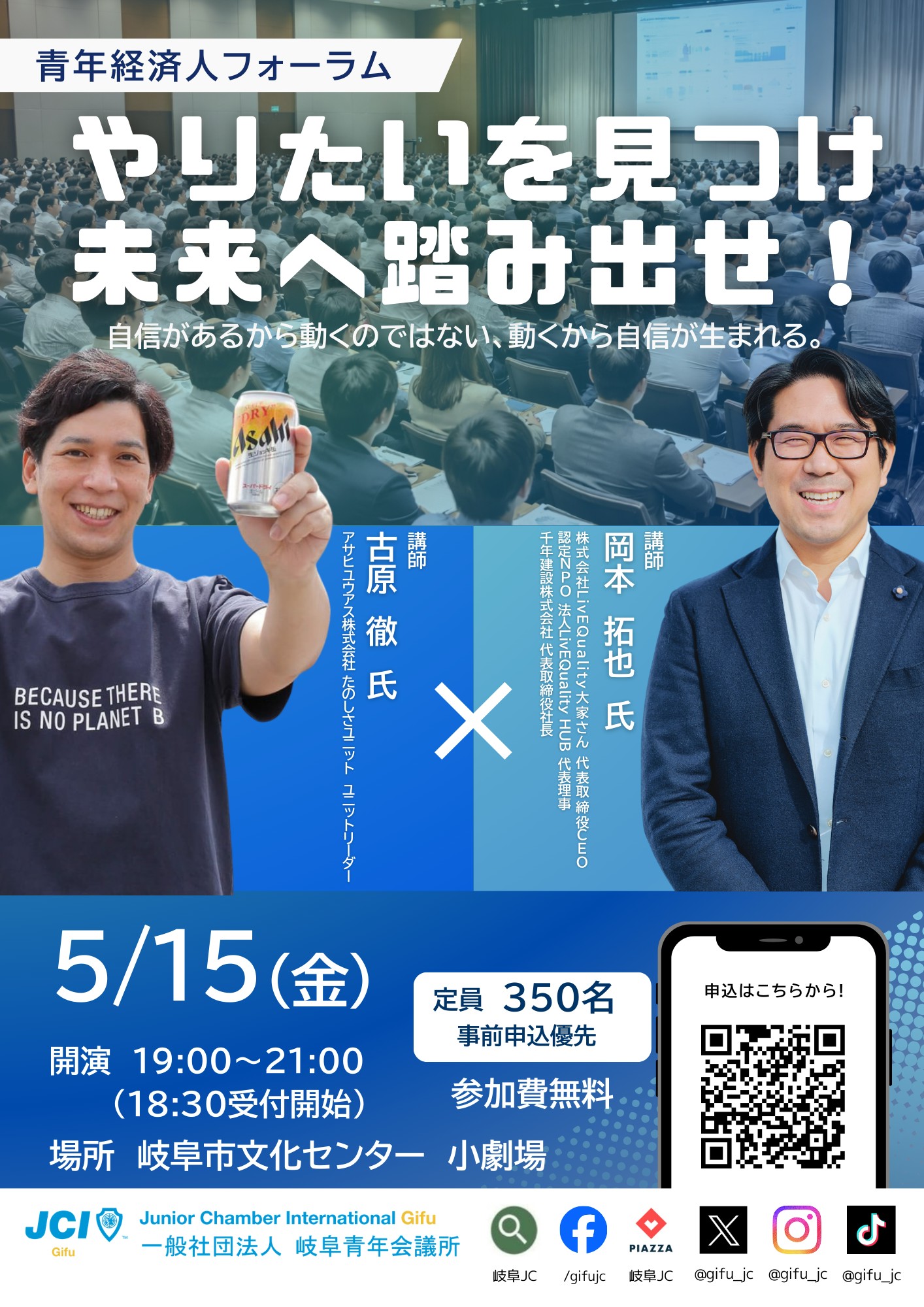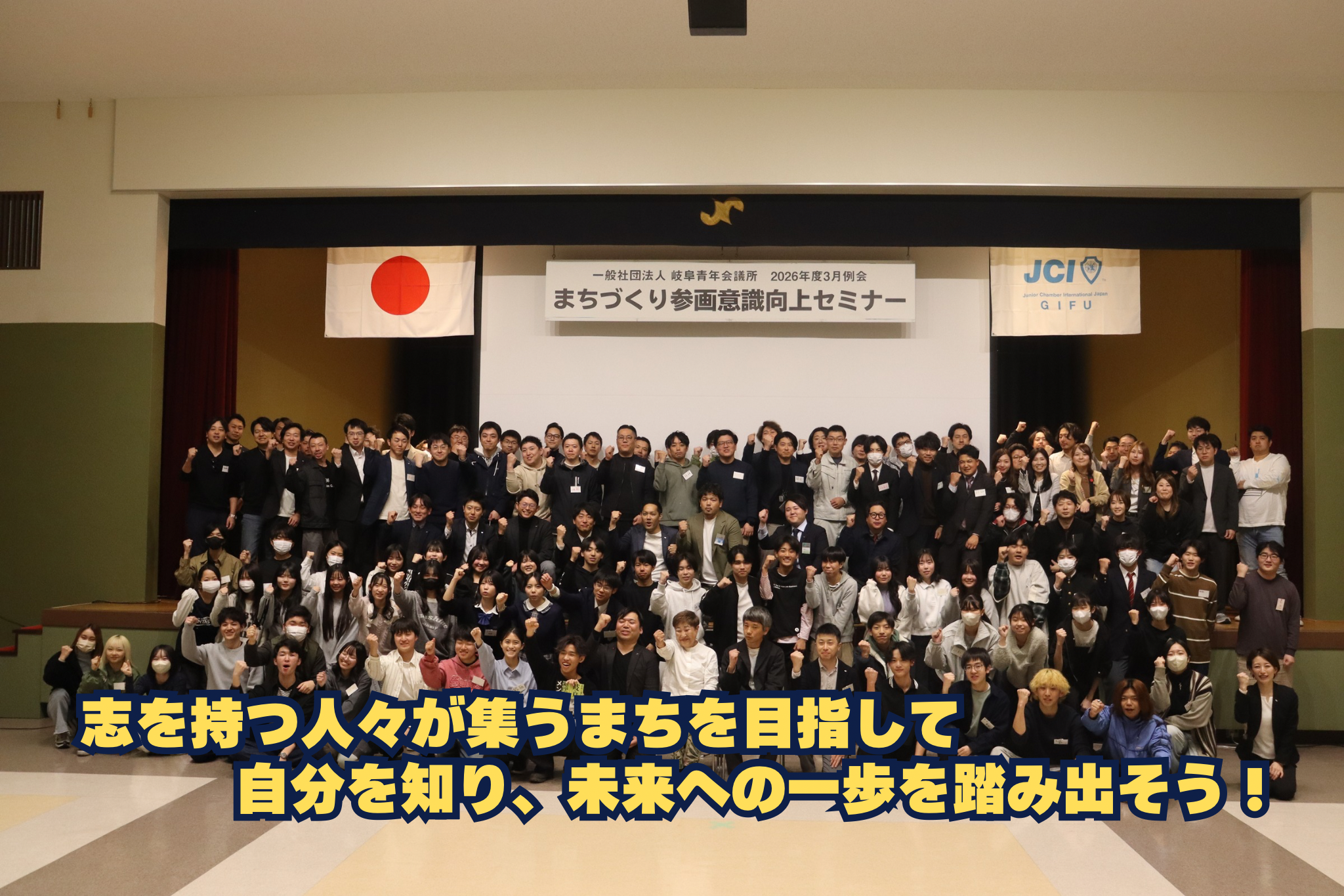 一般社団法人 岐阜青年会議所では、人口減少が進む現代において、地方都市であるぎふのまちが地域の活力を失うことなく持続発展していくまちとなるために、地域の課題解決と次代を担う若者の積極的な参画が必要であると考えます。ぎふのまちが様々なパートナーシップを生み出し、地域の課題解決とまちづくりに積極的に取り組む主体者としての若者を創出していきます。若者の積極的なまちづくり活動によって、行政だけでなく各種団体・コミュニティ・企業・市民を巻き込み、そこから生まれる個性的な発想や、魅力的な取り組みは多くのひとを惹きつけるのです。個性的な発想や魅力的な取り組みによって多くの市民が、身近な課題に気づき、自らが地域課題を解決するためのムーヴメントを起こしていきます。そして、ぎふのまちは若者を中心に市民が理想の未来を語り合い、夢や希望を叶えるための先進的な試みに心を躍らせ、国内外のひとが面白さと可能性を求めて集まるまちとなる必要があるのです。