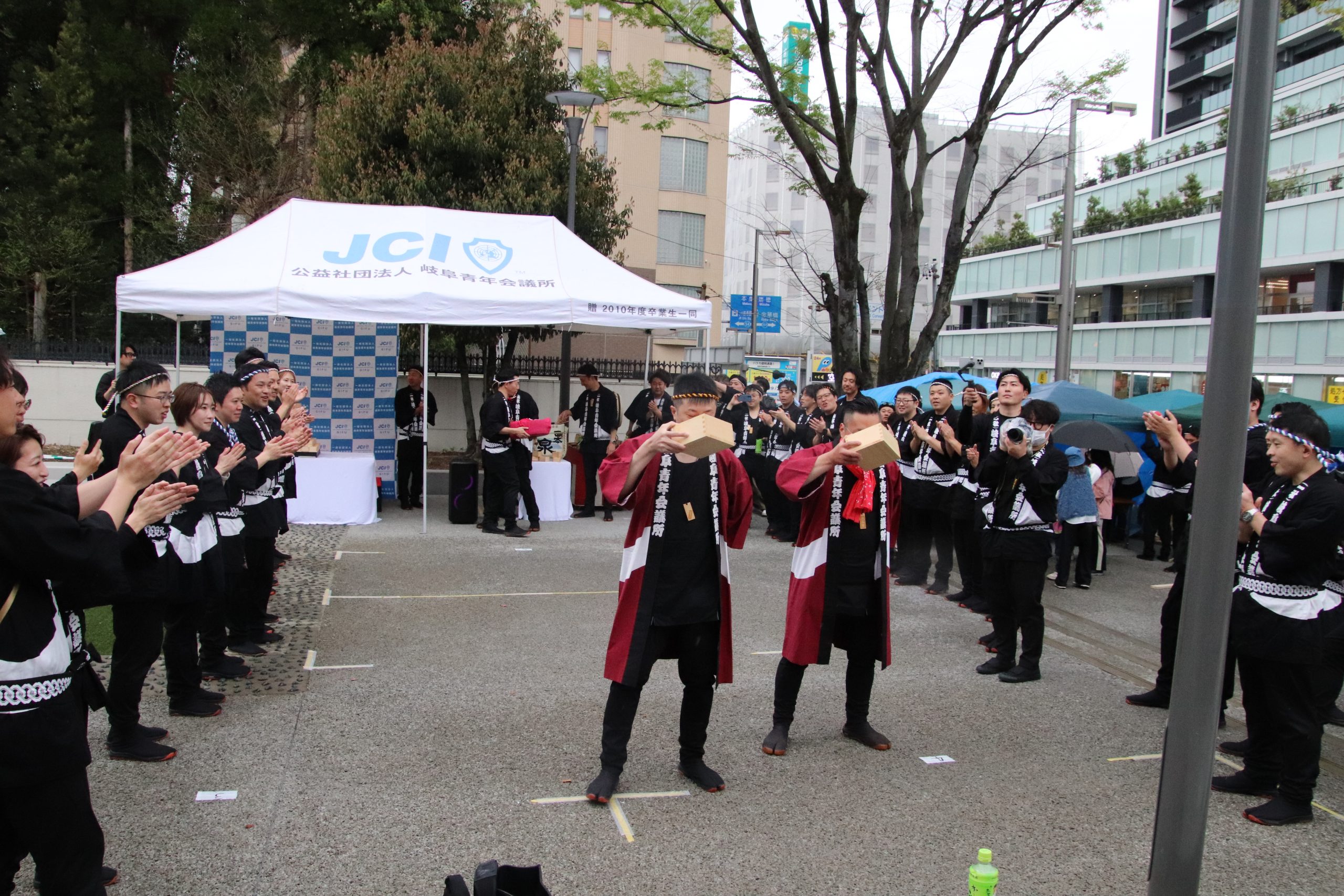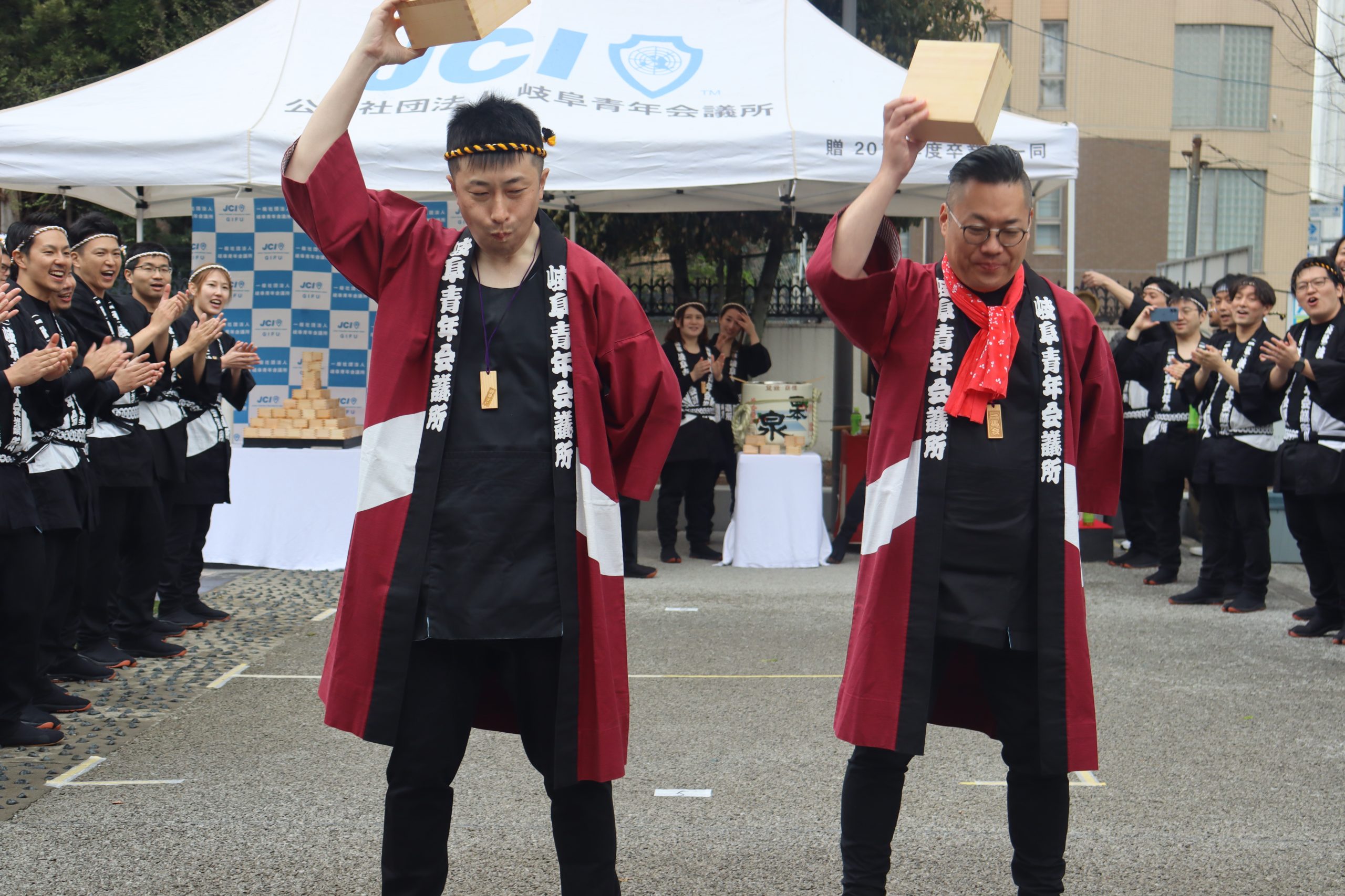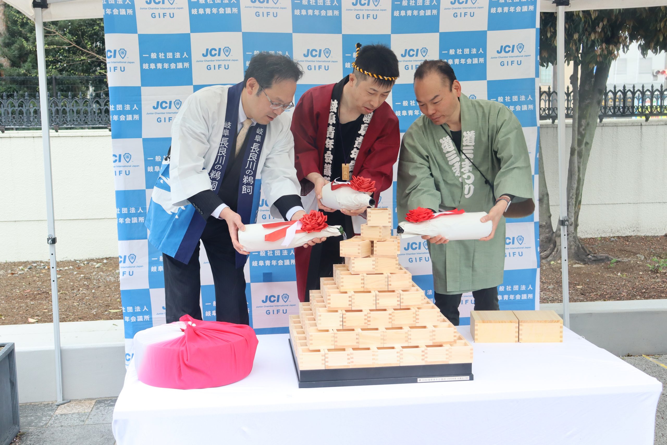 また、神輿担ぎの対内出発式として、本年度の岐阜JCの会員数である145個の升を用いた「升タワー」を設置し、今後のさらなる組織の発展と、ぎふのまちの皆様に大いに期待いただけることを祈願し、注酒式を執り行いました。なお、注酒式には、岐阜市副市長 阿部一臣様、NPO法人ぎふ睦理事長 鈴木博幸様にご臨席を賜りました。