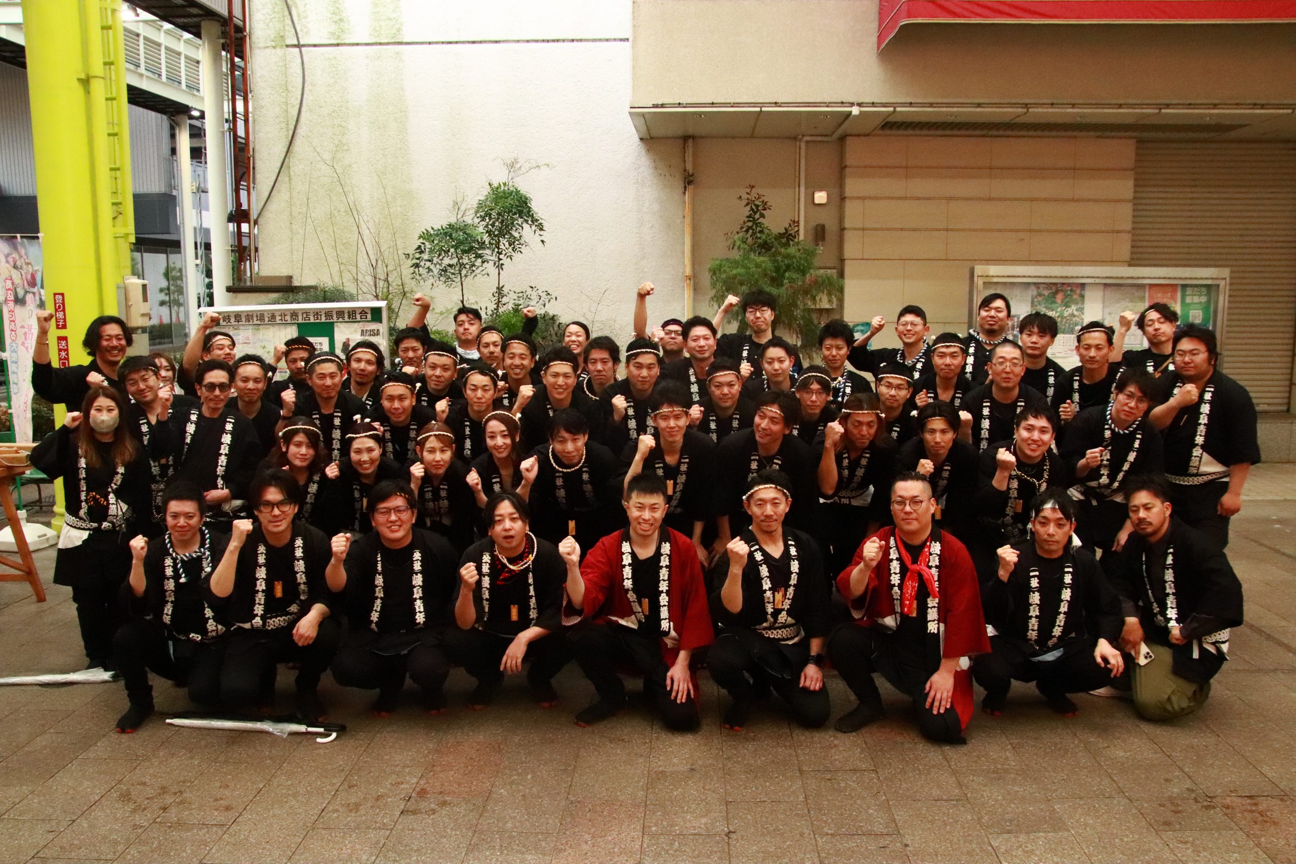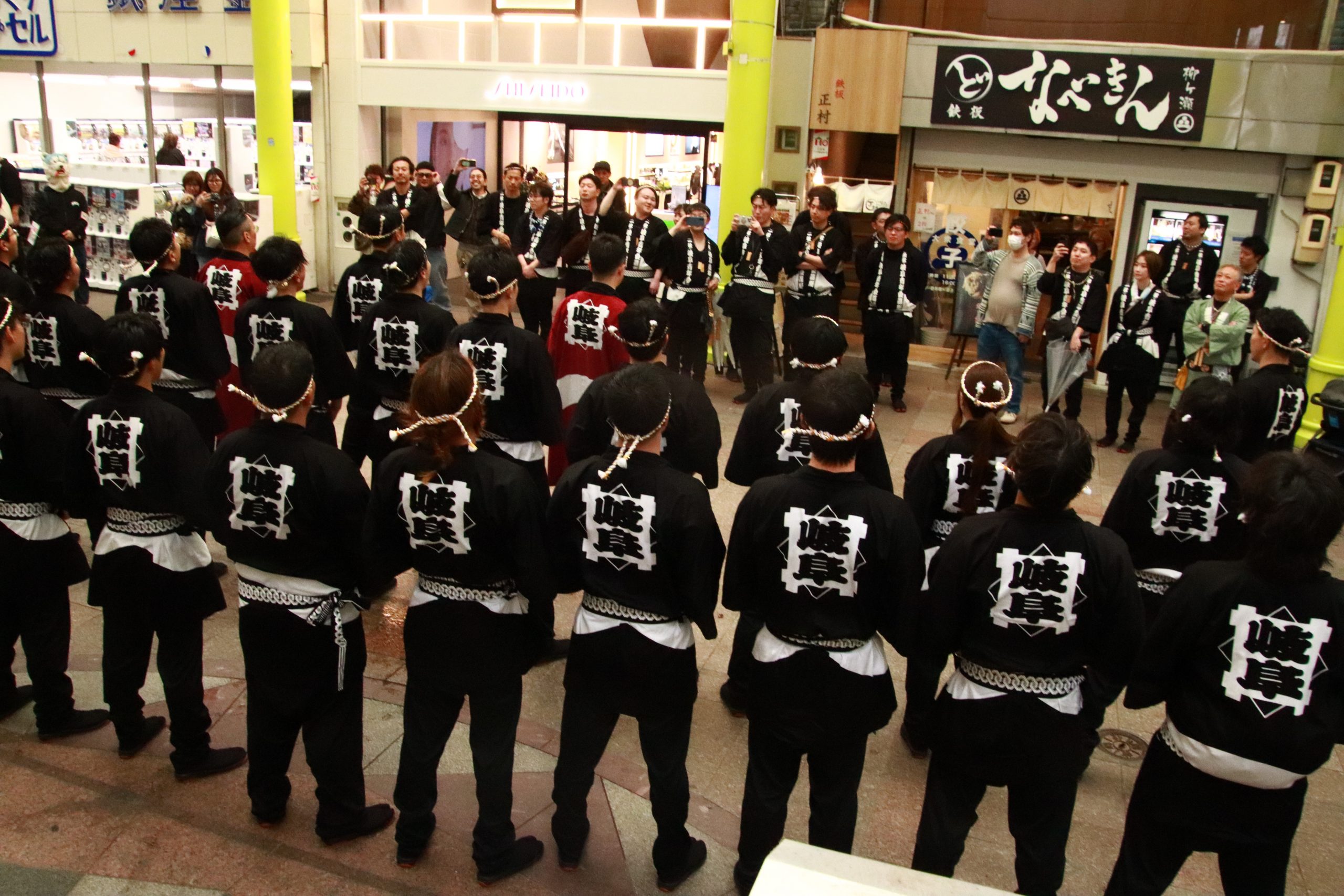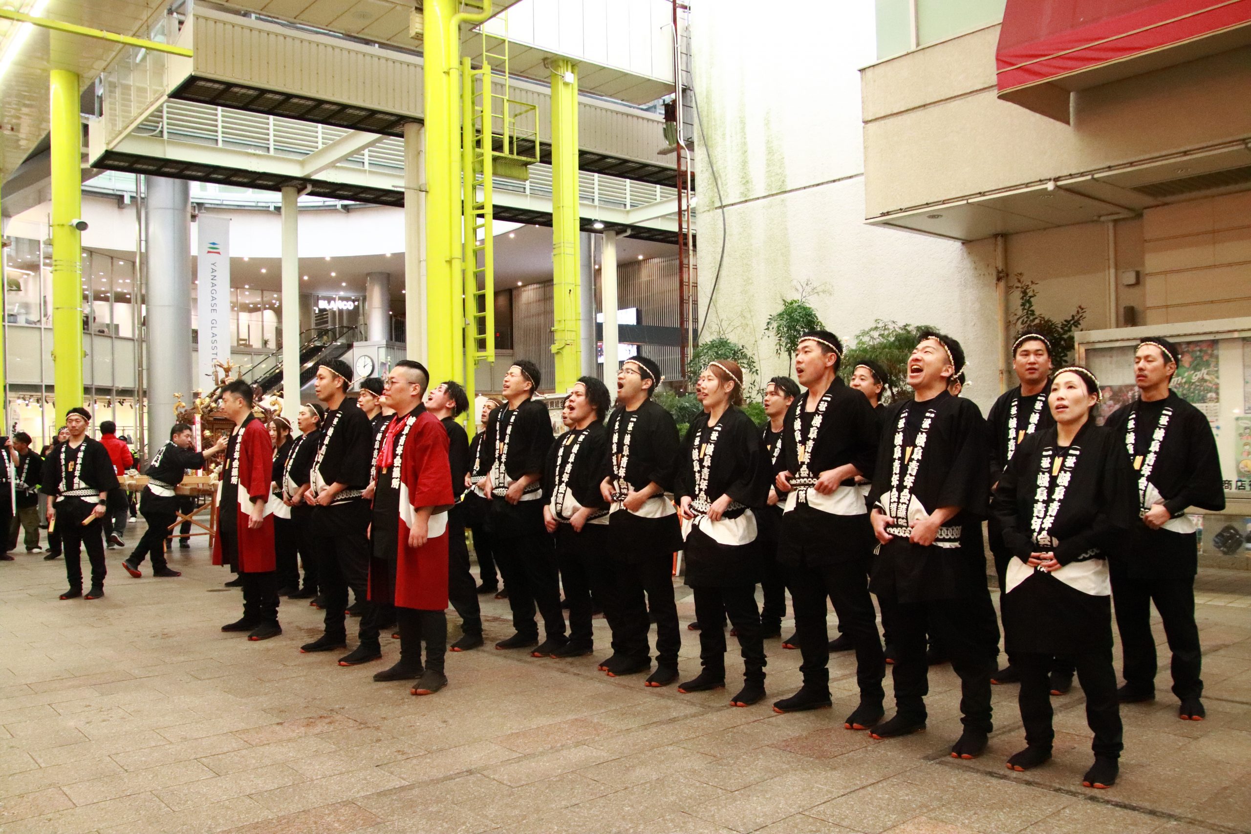 スクール生による「木遣り唄」を金神社、柳ヶ瀬商店街(旧:高島屋前)にて披露させていただき、会場からは大きな拍手で盛り上がり、雨が降りしきる中、ぎふのまちの賑わいを願う熱気に包まれた時間となりました。