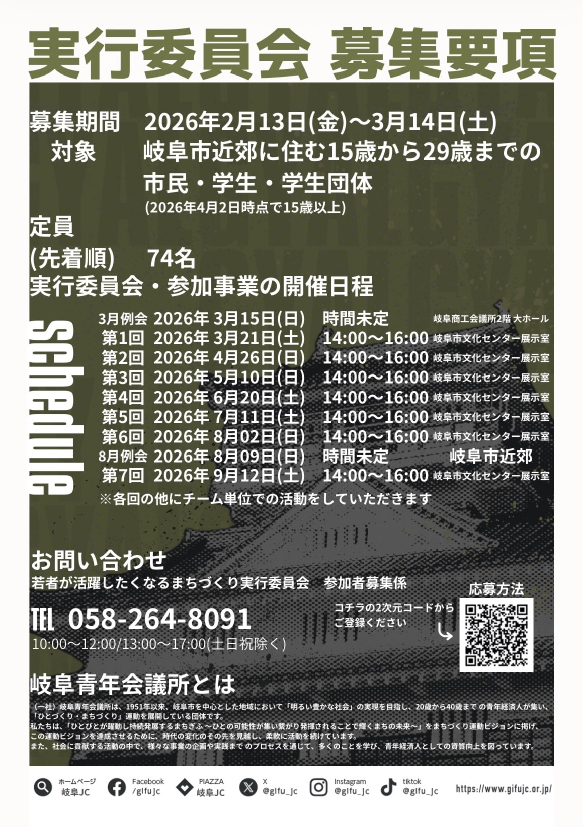 一般社団法人 岐阜青年会議所では、2026年度事業として「若者が活躍したくなるまちづくり実行委員会」を設置し、本事業に参加いただく実行委員会メンバーを募集いたします。本実行委員会は、若者が自らの発想で地域と関わり、仲間と共に挑戦することを通じて、まちの魅力を再発見すると共に、地域に新たな風を生み出すことを目的としています。事業を通じて、行動する楽しさや、ひととの繋がりを実感し、次の世代へと続く「挑戦の連鎖」を生み出していきます。